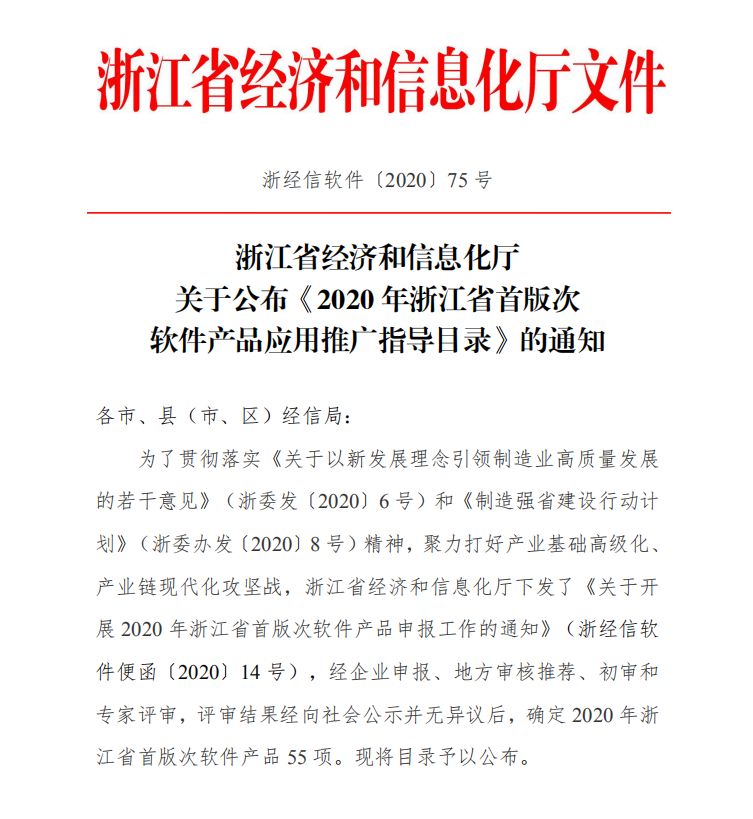 近日,浙江省经济和信息化厅发布了《2020年浙江省首版次软件产品应用推广指导目录》,确定 2020 年浙江省首版次软件产品 55 项。