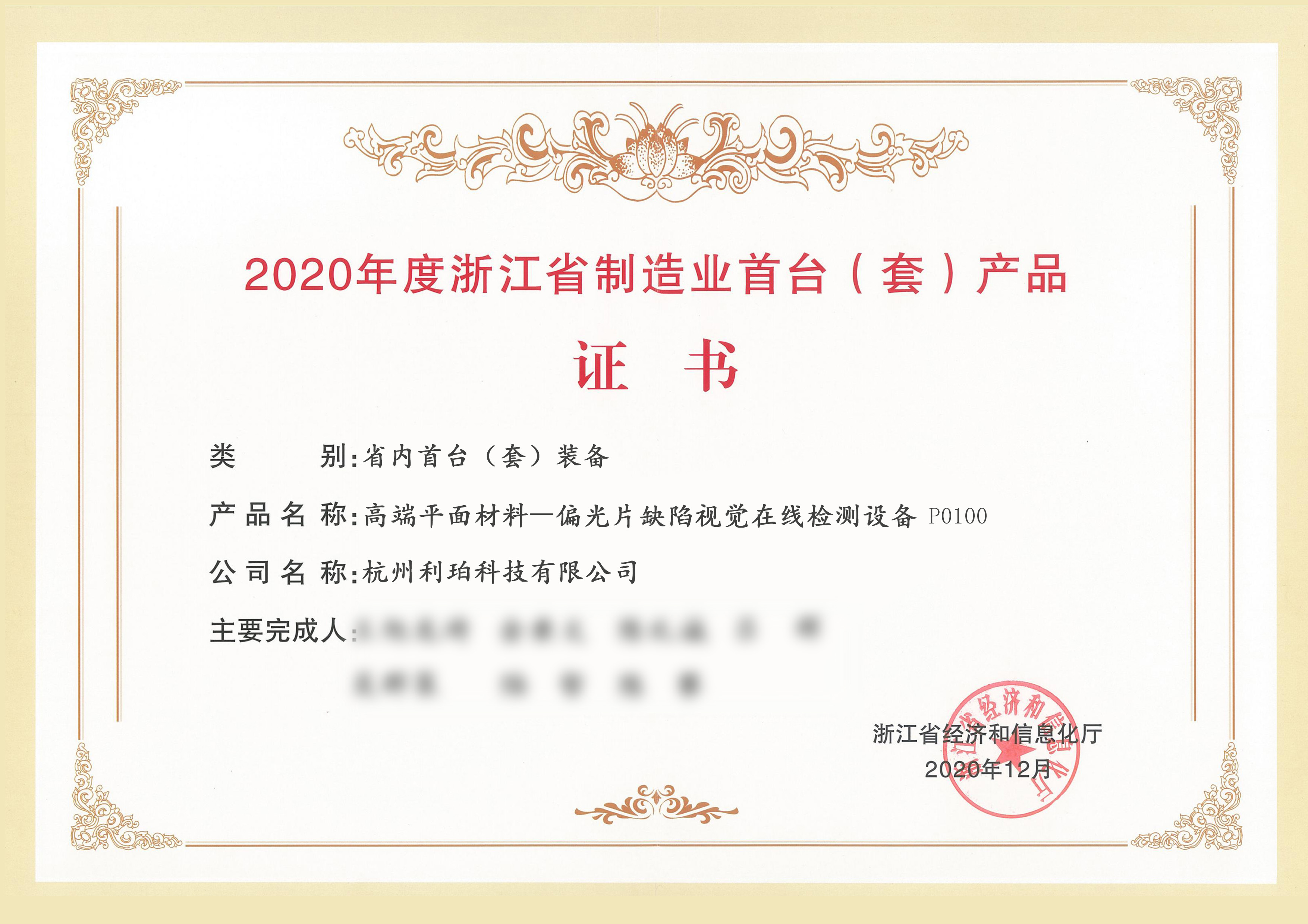2020年度浙江省制造业首台(套)产品证书-省内首台套装备...